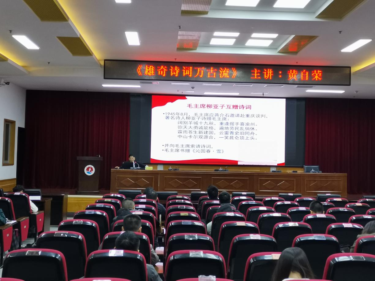 为纪念毛泽东同志诞辰130周年,学院副院长黄自荣作《雄奇诗词万古流》的选修讲座,详细介绍了毛泽东诗词的概况、内容和特色,并从毛泽东诗词的传承、创新和意义等方面,深入探讨了其中蕴含革命文化精神和的湖湘文化特质以及统战思想意蕴。