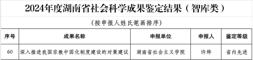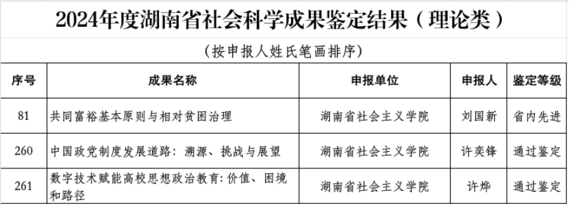 近日,湖南省社会科学成果评审委员会博鱼平台_博鱼(中国发布《2024年度湖南省社会科学成果鉴定名单公示》,我院申报的4项成果全部通过鉴定,其中2项成果鉴定等级为省内先进。
